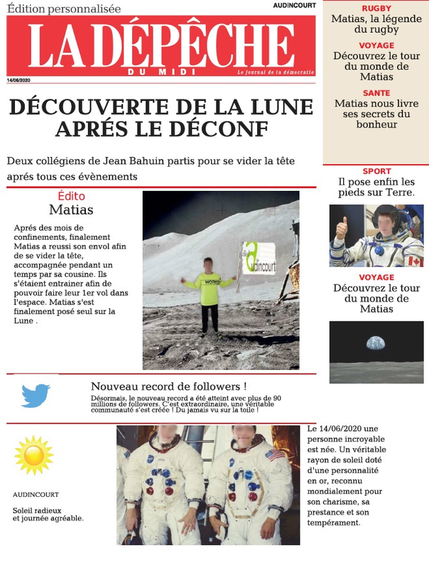 Invente la une d’un journal fictif illustrée par une ou des photographies qui rendront crédible cette « fake news ».